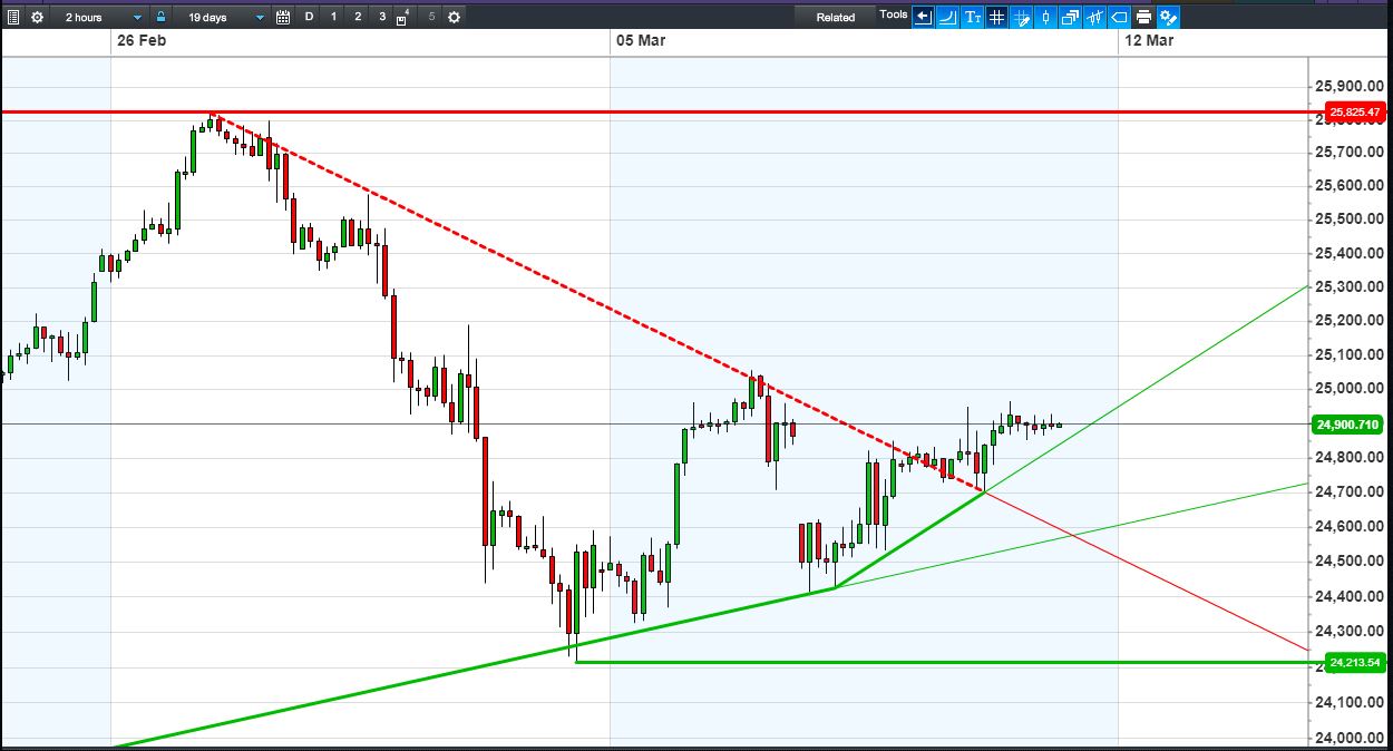 The UK Index 100 is holding its break above 7185. The DAX 30 is holding its break above 12275. Dow Jones Futures are flat around 24900. Gold has bounced from $1317 to test falling highs resistance.
