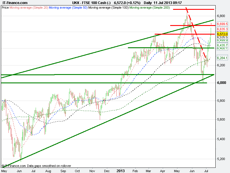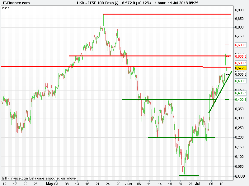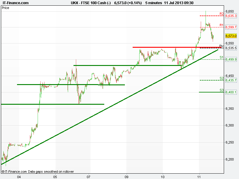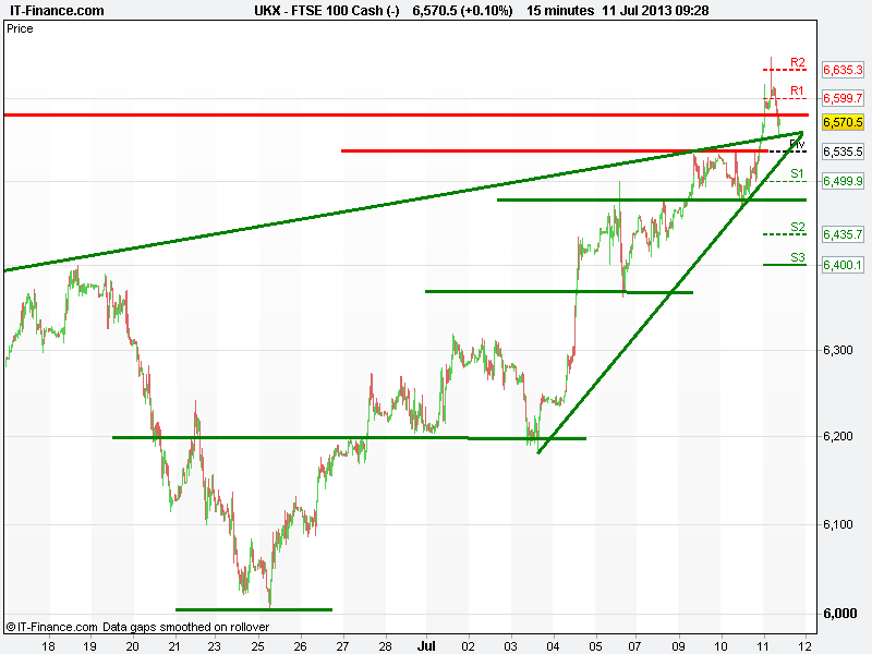 Ben Bernanke’s comments propelled the UK Index north at the open today. However the ‘support-turned-resistance’ of the rising trend line, Resistance 1 at 6600pts and the psychological (perceived) importance of the round number have proved a formidable force and pushed the UK Index down to the current level of 6565pts, leaving us equal distance from Resistance 1 and today’s pivot point. Look for possible price action at these levels, 6600 and 6535 respectively. US equity markets are yet to fully react to Bernanke’s comments (speech made after-the-bell) and so the UK Index could benefit from a ‘second wind’ around 14:30 should our friends across the pond trade with enthusiasm. A breach above Resistance 1 and 2, the latter at 6635 could clear the way for a run up to 6700 (R3).