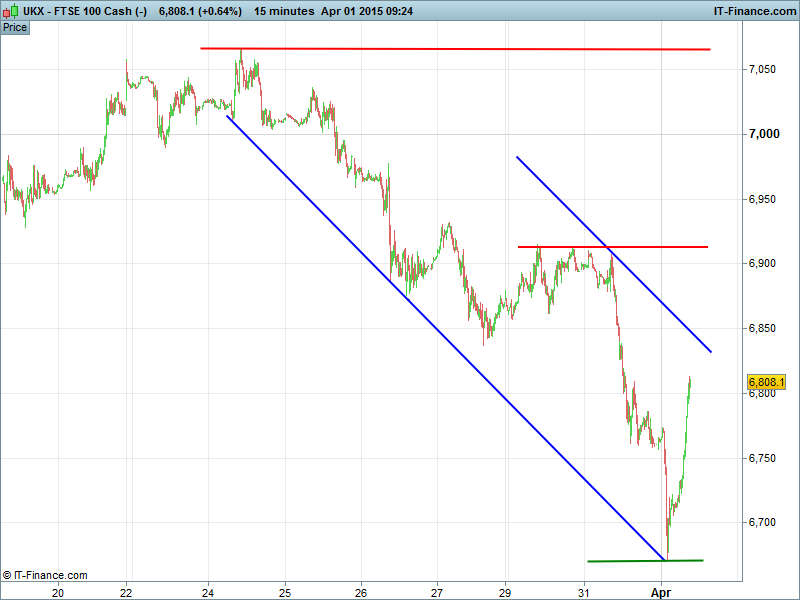 UK 100  has bounced off support at 6671 after a massive sell off yesterday and is climbing back up towards the upper bound of a downwards channel that began shortly after the making of fresh all-time highs on 24 March.