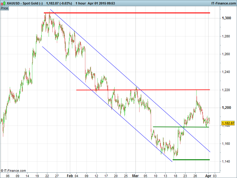 Gold is still heading sideways today, but south for the first quarter of 2015 in fairly textbook tramline style. Looks to have found support at $1178 although a decisive bounce off this level has not materialised.