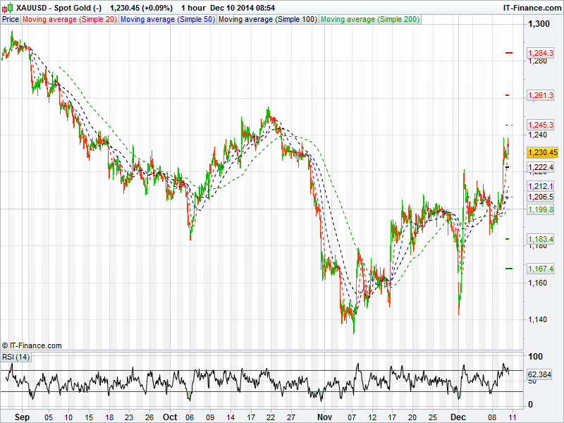 Spot Gold is continuing its recovery from the lows of last month trading at 6 week highs as investors seek less risky assets with equities falling and a fall in the price of the Dollar boosting demand for Gold. Support should now come at the 50 day moving average around 1212 and at 1206. The RSI has now broken out of overbought territory.