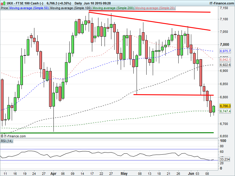 UK 100  found support at 6747 from 200-day MA and to get back overnight hurdle 6750. Breakout above falling highs from 3 Jun a good sign for the bulls. Rally back to recent breakdown and falling highs from end-May at 6810? Or just a ‘fake-out’ before another leg down.