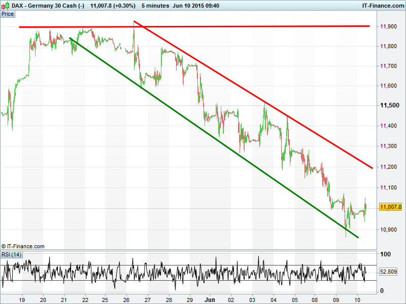 Germany’s DAX back above 11000 after yesterday’s foray lower. Rising lows over the last 24hrs are suggestive of recovery, but falling highs from end-May still showing resistance at 11200. Falling channel persists.