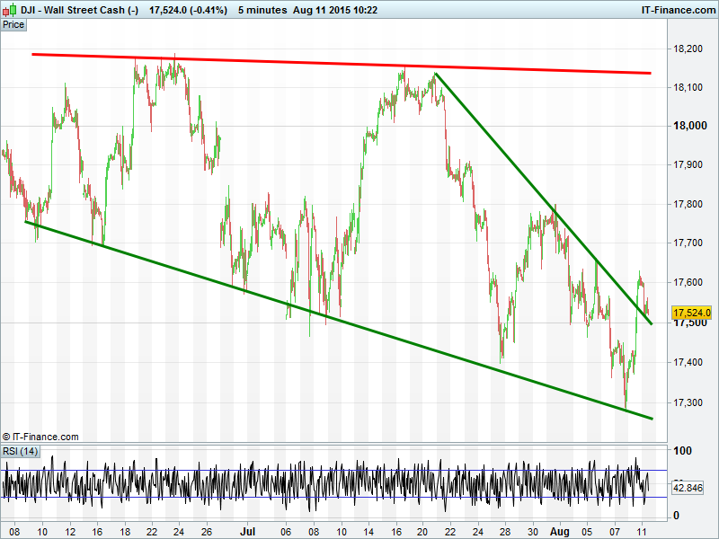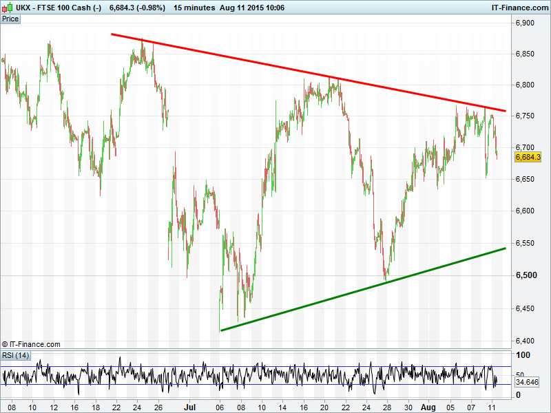 UK 100 back below 6700 having failed again at 6750. DAX down, but found support at yesterday’s 11430 lows. Dow Jones back from 17600 hindered by falling highs from mid-July. Gold seeing a new lease of life, with breakouts above both $1100 and falling highs from mid-June.