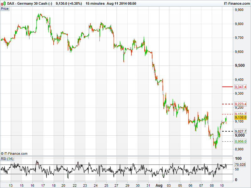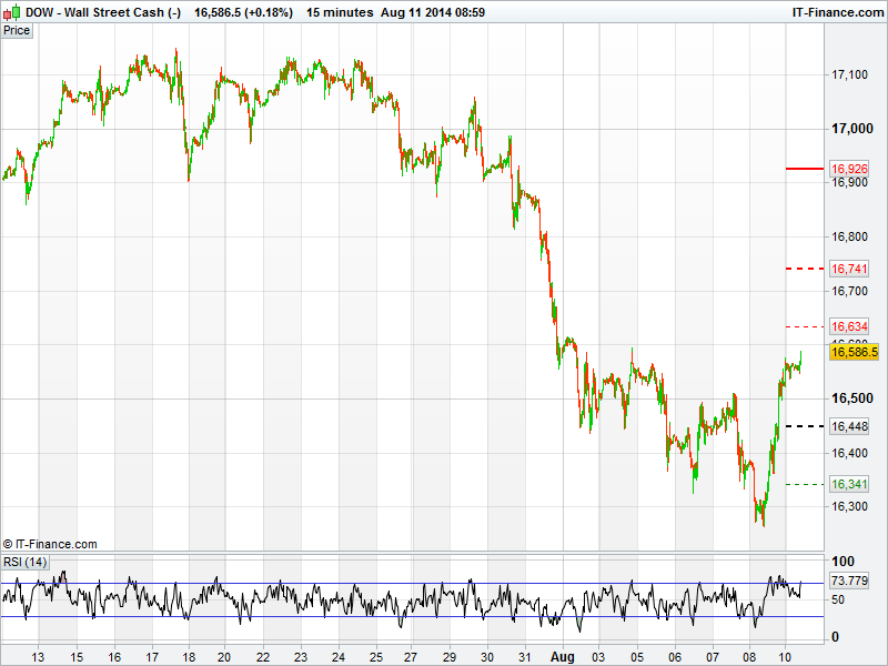 The US Dow Jones finished strong on Friday night after falling below mid May lows and has continued its strength into this morning with the futures pointing to a higher open. We are now at level that attracted some resistance late last week with a break of these levels signalling a return towards 17000. Developments in Russa/Ukraine, Gaza and Iraq will no doubt play there part in the direction of these markets too. However, with little resistance in the way, the DOW could eat into the losses seen over the last week or so and again look to head north.