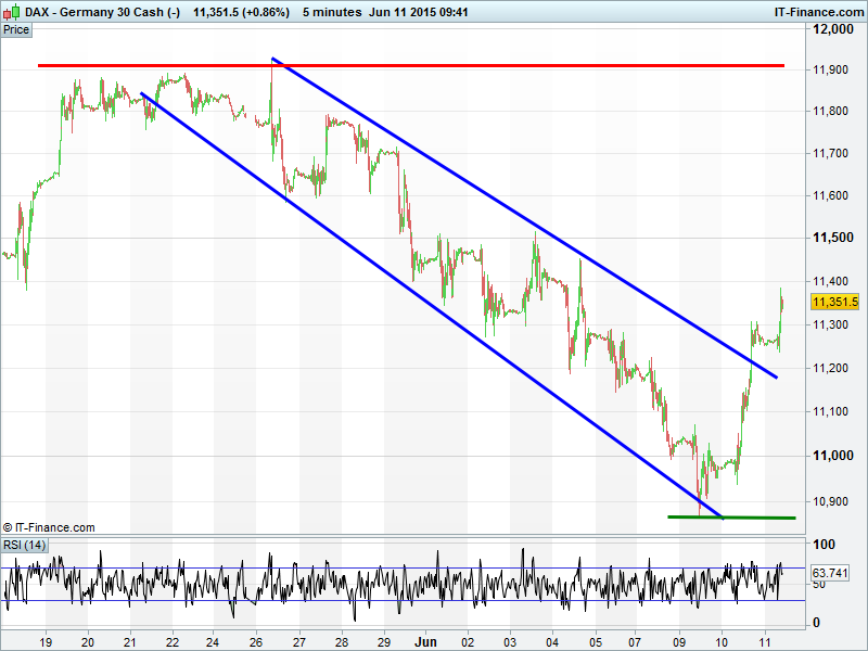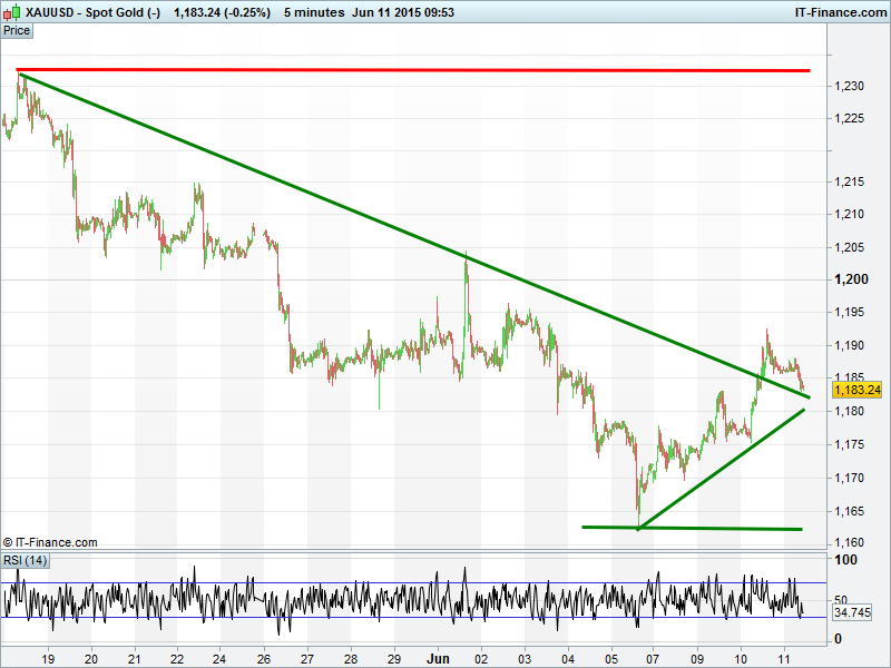 UK 100  and DAX both broken out of falling channels. UK Index , DAX and Wall St all displaying bullilsh flag patterns with upside potential. Gold falling back towards support at $1180.