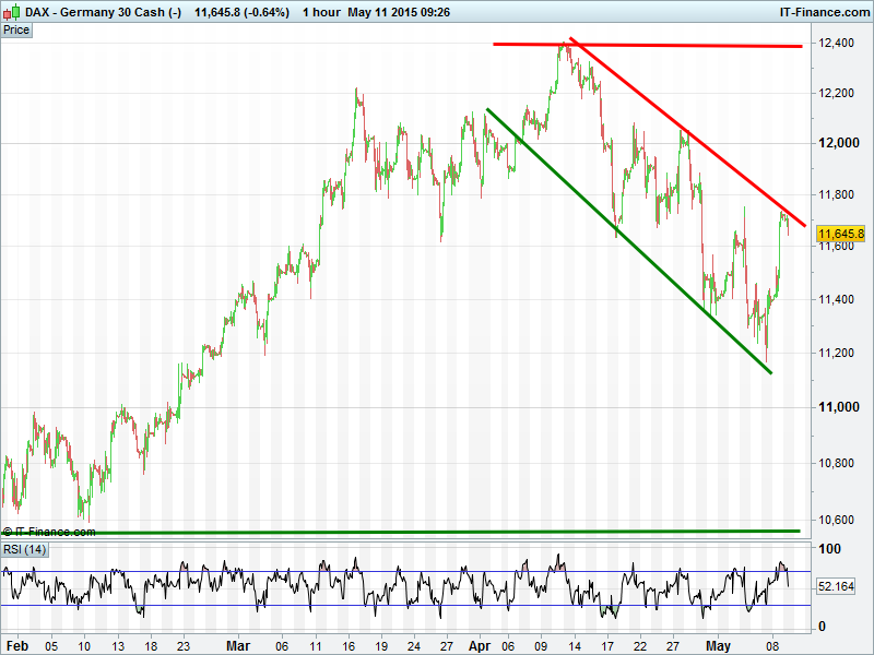 Germany’s DAX has found resistance at last Monday’s highs and the ceiling of its falling channel from mid-April. Daily chart shows index holding uptrend from mid-October but Daily RSI still in decline.