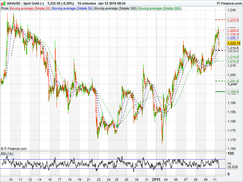 Spot Gold has fallen off this morning after trading at a one month high overnight. After breaking below its 50 and 100 day moving averages support could come into play at the 200 day moving average around 1214. The RSI is also declining and is now trading towards oversold.