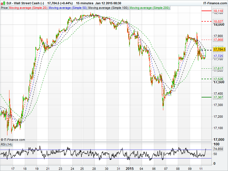 US Dow Jones is finding support around 17700 while resistance on the upside is likely at the 200 day moving average around 17800. The 100 day moving average has crossed below the 200 day moving average whilst the RSI ave moved into overbought territory.