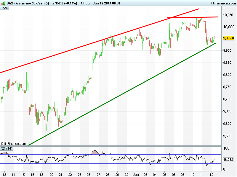 Germany’s DAX found support where expected – 2-month rising lows – at 9910 and RSI has rebounded from oversold. There is potential for a return to highs of 10025, but any break lower would take us to 9865.