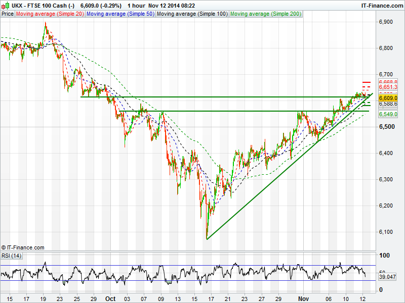 Global markets are being held lower this morning as the violence in Ukraine escalates with the ceasefire seemingly collapsing. Fighting has returned to levels that preceded the ceasefire, which could signal further sanctions against the Russians.  US markets closed relatively flat on light volumes due to Veterans Day Holiday, whilst the European peers pushed higher, making further headway into the loses of last month. For the UK’s UK 100 , corporate earnings are still dominating proceedings and providing direction. Macro data in the form of unemployment as well as the BOE’s inflation report due for release this morning could add some volatility to the UK 100 .