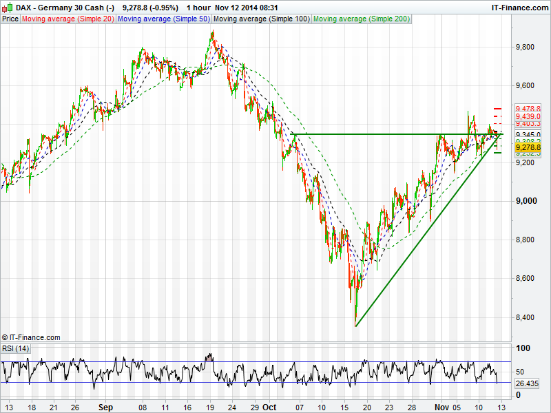 Germany’s DAX has broken below its 3 week rising trend line this morning, also falling below its 50, 100 and 200 day moving averages. Should support at 9290 fail to hold then we could see the DAX heading down towards 9250 before possibly 9150. The RSI is continuing to fall, now into oversold territory.