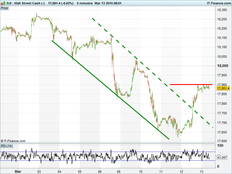 The US Dow Jones has hit resistance at 17900 after posting gains on Thursday to break out of its March downtrend. Previous falling highs yet to be confirmed as support while new 2-day rising lows more likely to help the index back to all time highs.