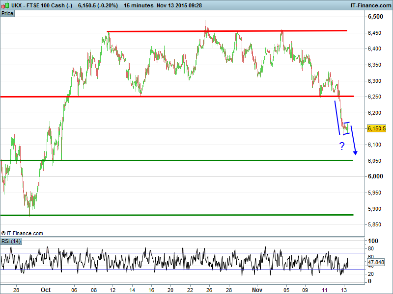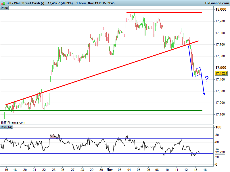US Dow Jones futures’ Nov downtrend intensified overnight and, like the UK 100 , could be in consolidation phase of a bearish flag pattern. Also potentially vulnerable to risk-off selling into the weekend. Note however the RSI has returned from oversold this morning.