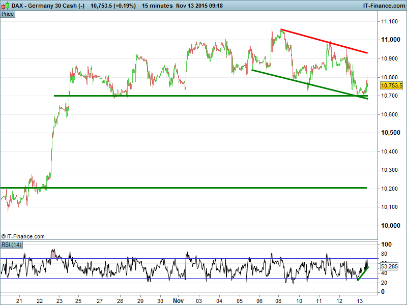 Germany’s DAX made a rough double bottom bounce off 10700 overnight but back under pressure this morning having met resistance at a falling trend line which keeps the week-long trend of falling highs alive.