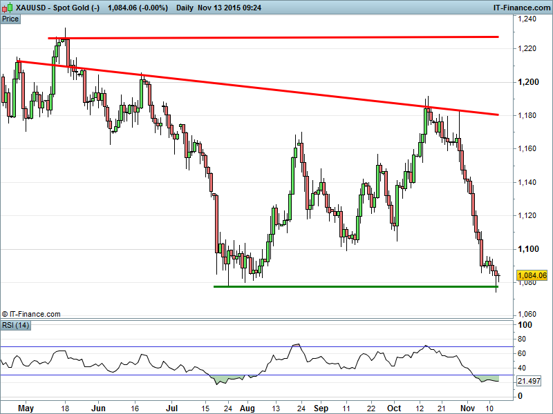 Gold languishing near historic lows as more clarity emerges regarding US Fed and ECB policy. Markets now betting on a US rate hike and clearly showing preference for interest bearing treasuries. Still, 5-year lows…..