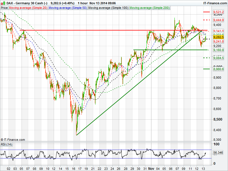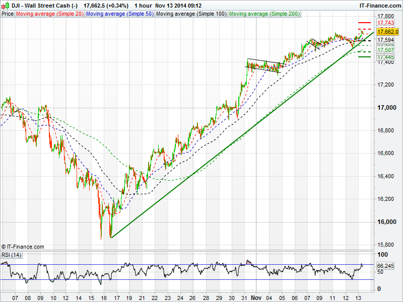 US Dow Jones registered another all-time high overnight as it trades up towards 17700. The 4 week uptrend is still intact with the 50 day moving average providing support. The RSI has turned lower and is now falling from overbought territory. The Fed’s Janet Yellen speaks this afternoon which could give the markets a further lift.