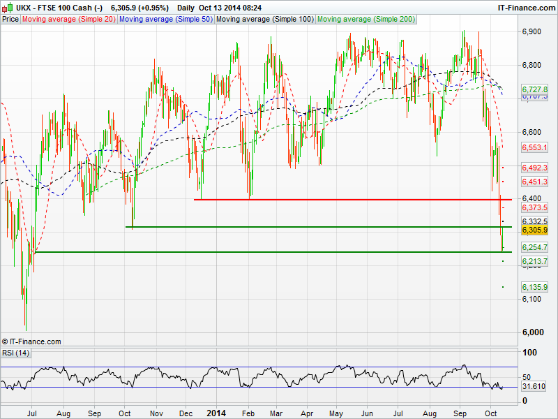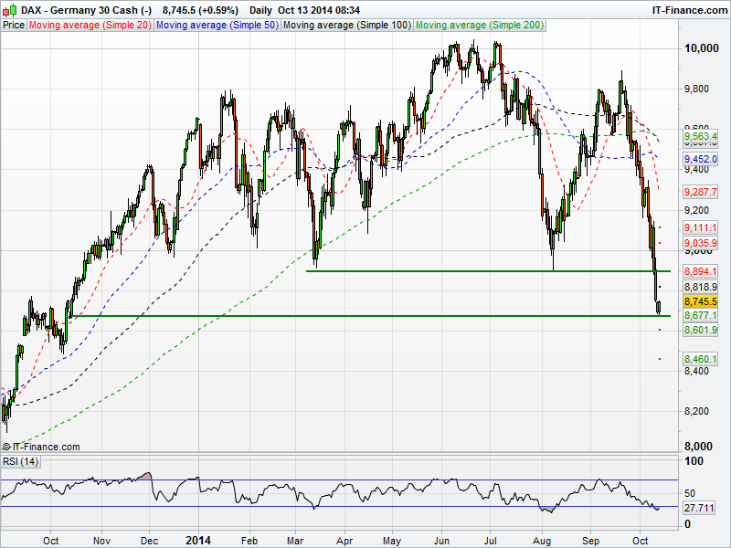 Germany’s DAX is trading at year lows this morning as the sell off continues. Support may come around 8532 with a break leading to a possible pull back towards 8000. The RSI has turned upwards but is still in oversold territory whilst the 100 day moving average has broken below the 200 day moving average.