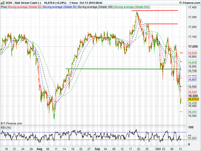 The US Dow Jones found support just above 16400 over night before bouncing back up towards 16500. Much like its European peers there seems very little in the way of support and August lows around 16260 could be seen again. The RSI has turned upwards after bouncing off oversold level. US earning season really kicks off this week with some off the big hitters reporting which could provide the direction for the markets.