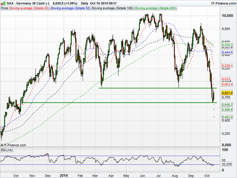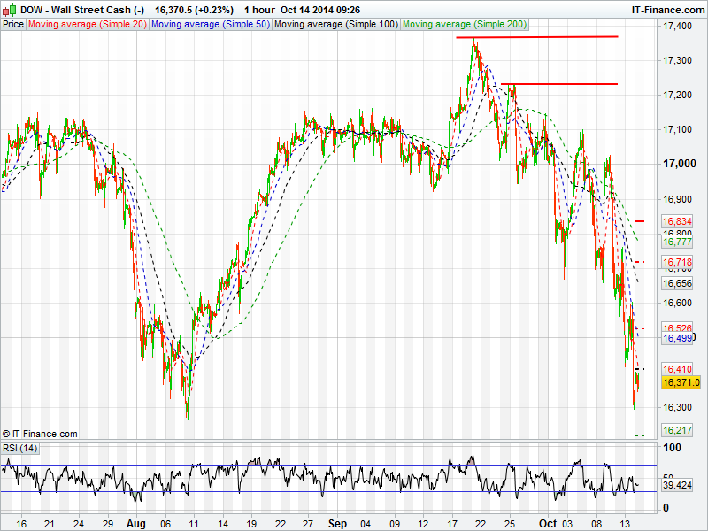 The US Dow Jones is trading towards August lows after finding resistance overnight at its 50 day moving average. Support was formed around 16300 before the Dow regained 70 odd points. The Dow could be driven by corporate earnings today as some of the big names, including Citigroup and JPMorgan release figures.