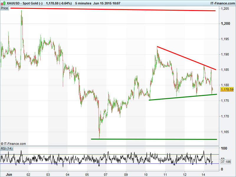 Gold trading sideways around $1180 in a narrowing pattern. Will there be a breakout or a breakdown. Converging triangles tend to be continuation patterns for the prior trend which in this case is bullish from 5 June lows, but within a longer term downtrend form mid-May mult-month highs.