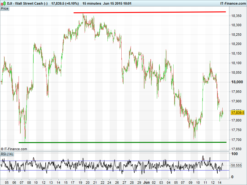 US Dow Jones failed to hold above 18000 after bouncing from May lows 17684. Downtrend from 19 May remains to be broken, but support at 17800 (thanks to 200-day moving average) gives some hope of reversal via rising lows.