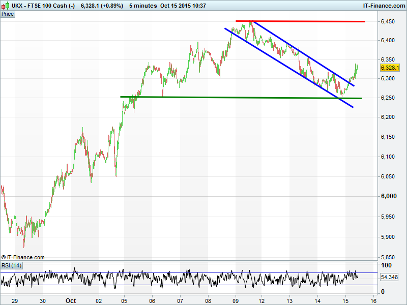 UK 100 broken out from falling channel. Potential for breakout to return to recent highs As suggested yesterday, could have been a bullish flag pause before repeat of prior 600pt rebound.
