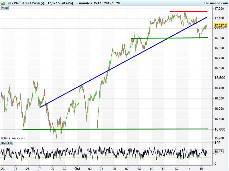 US Dow Jones futures back above 17000 after an overnight breach. Note however potential for intersecting trendline to hinder any return to recent 17170 highs.