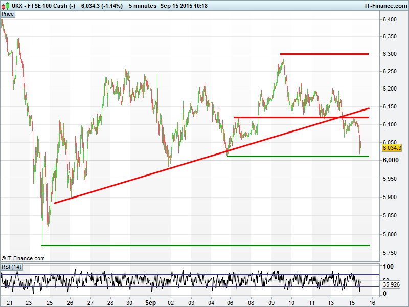 UK 100  broken below trend-line of rising lows from Aug 25. Trend-line turned resistance overnight after retest of 6120. Uptrend still alive thanks to bounce near 6010, but falling highs and lows from 8 Sept can’t be ignored.