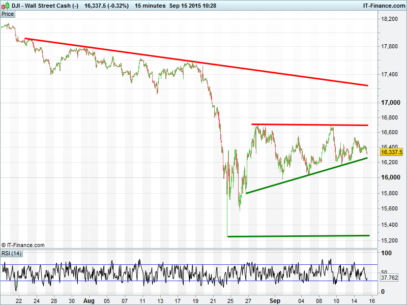US Dow Jones futures uptrend from Aug 26 intact. However, after yesterday”s failure to better 16500, watch falling highs from Sept 9 for potential to generate a break of the rising trend at 16200.