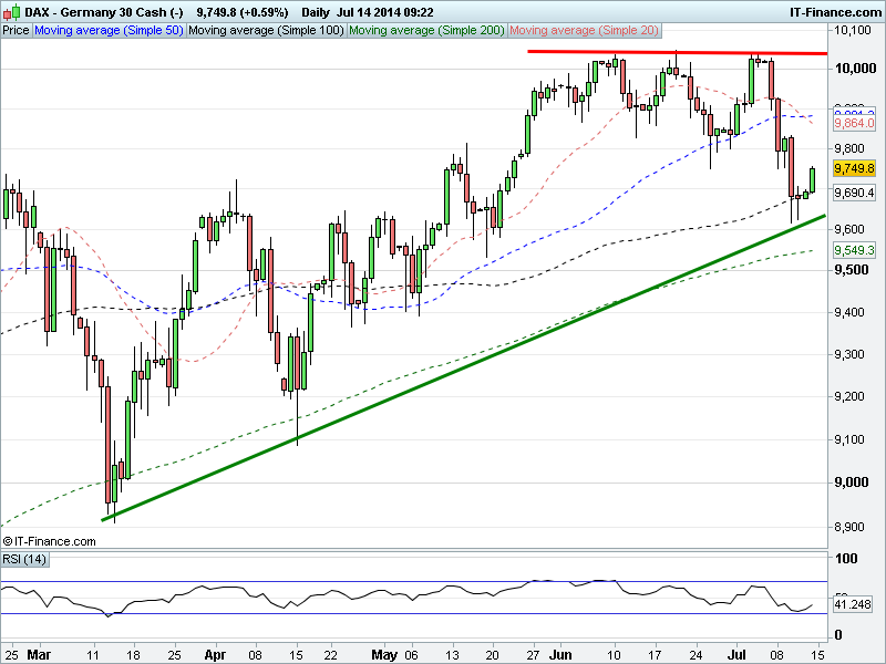 Equities still in recovery mode from recent correction lows helped by overnight China data, a relatively dovish testimony by Fed chair Yellen (although not without the usual fence-sitting caveats) and so far decent Q2 results from the US. This also despite news that Portugal’s Espirito Santo woes continue which bodes well in terms of investor maturity regarding negative drivers while equities trade near highs.
