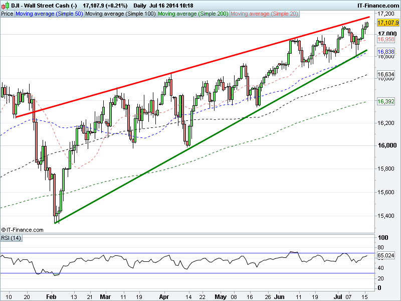 The US Dow Jones has made fresh all-time highs this morning. The rising wedge-like pattern from February holds although we are again approaching the upper boundary. US results still offering help with more positive than negative surprises. RSI remains in upper half of chart which is bullish.