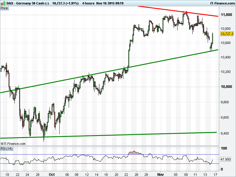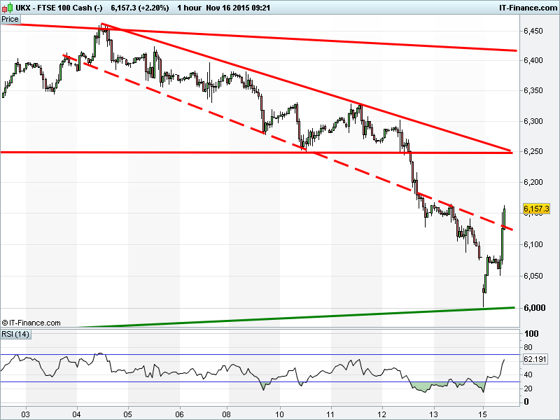 Equity markets positive this morning, showing solidarity and resilience in the face of adversity with the Parisian bourse the standout performer in a message of unity to those who terrorized it this weekend. Economic data and central bank policy on the back seat for the moment, as the indices recover from recent lows after a commodities led rout.  Index corrections over?