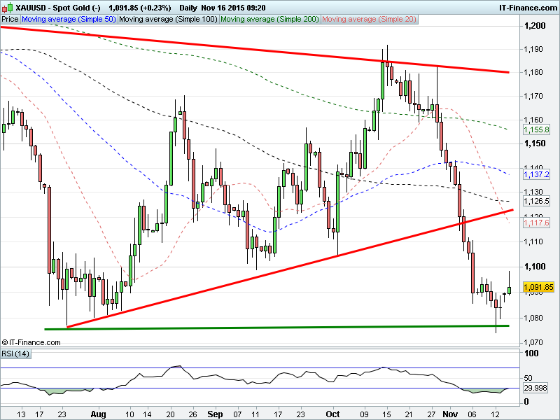 Gold bounced off recent lows helped by safehaven seeking and in spite of USD strength. Work to do before the word rebound can be employed