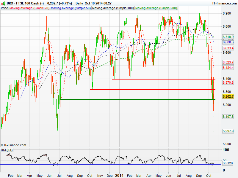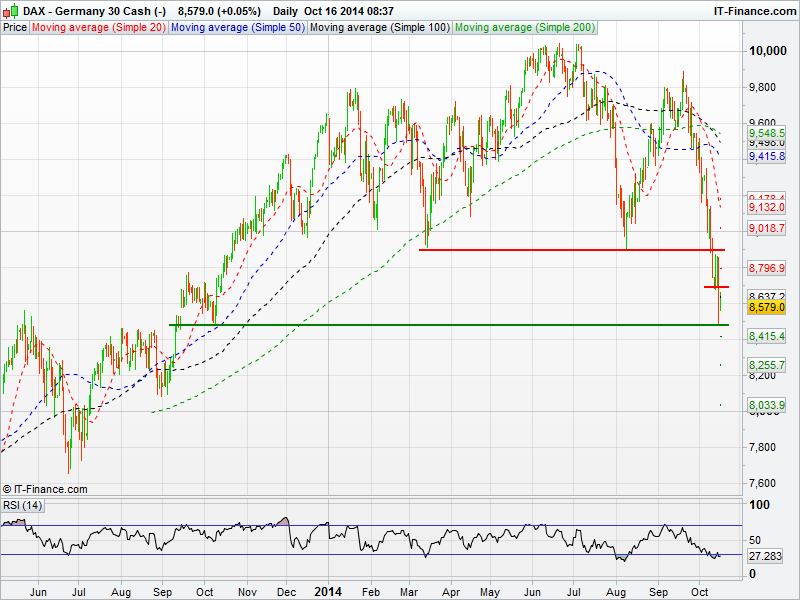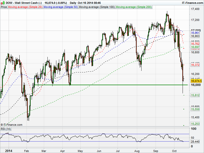 The US Dow Jones hit an 8 month low yesterday in an extremely volatile trading session that saw it briefly trade below 16000 for the first time since February. Volatility is causing extraordinary intraday moves with the Dow swinging in the region of 500 points yesterday. The RSI has moved into oversold territory for the yesterday for the first time since early August.