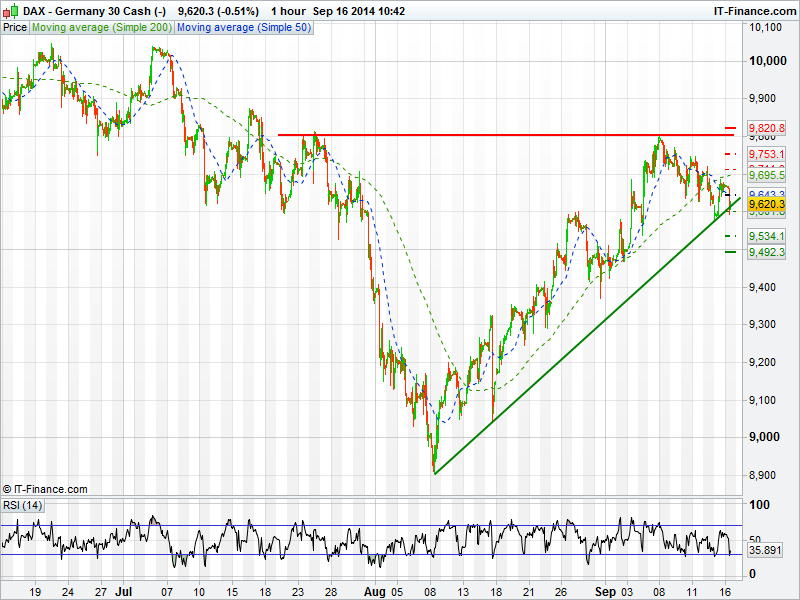 Germany’s DAX has broken below its 5 week rising trend line this morning, with a sustained break possibly seeing the Dax pulling back towards the 9400’s. The RSI has bounced off oversold and we have see the 50 day MA cross below the 200 day MA.