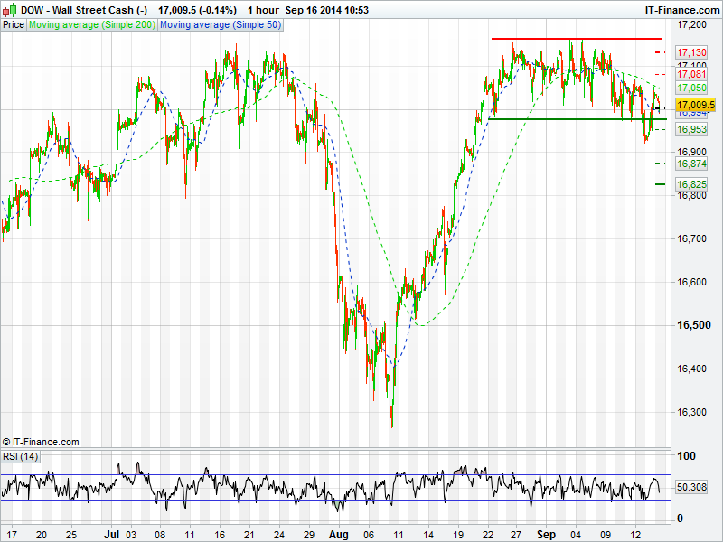 The US Dow Jones failed to convincingly break the support it had found over the last 3 weeks and is now back above the 17000 level. Traders will be turning their attentions to tomorrows FOMC meeting for signs of the time frame on an impending rate rise. Resistance on the upside may be found at the 200 day MA around 17050.