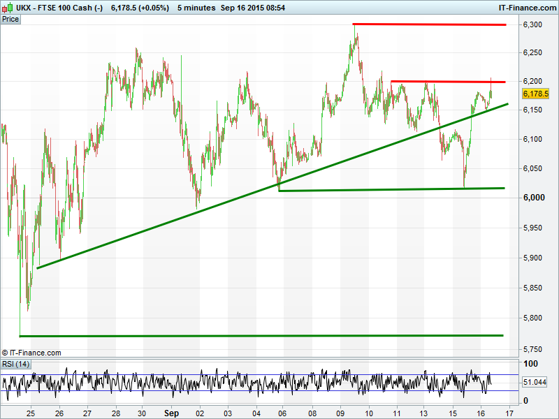 UK 100  back above recently breached trend-line of rising lows from Aug 25. This keeps uptrend on track, but progress above 6200 resistance remains to be seen this morning.