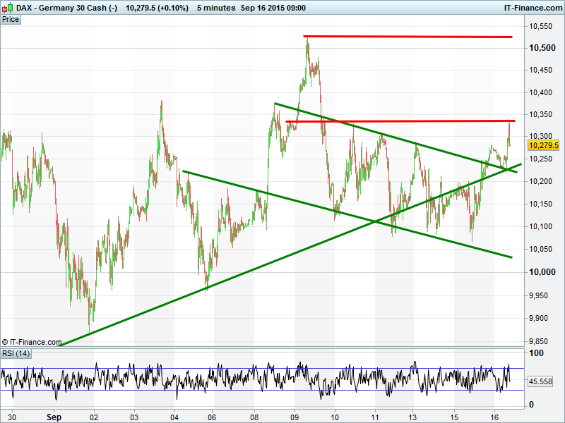 Equities higher this morning, building on yesterday’s gains following a positive session in Asia overnight. Fear appears to be receding about a potential rate rise being announced at tomorrow’s Fed policy update after much debate over whether the recent risk-off mentality had become an overcrowded trade. Another sharp rise by Chinese equities towards the session-end (thanks to intervention) has also boosted risk appetite despite global growth concerns remaining very much to the fore.
