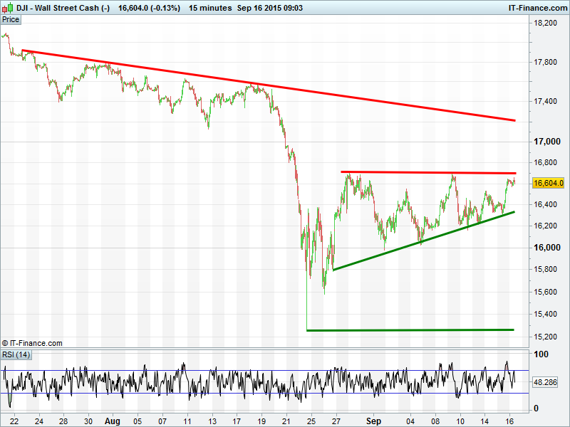 US Dow Jones futures trading close to recent highs. Breakout or retrace? Support around 16600 overnight. Bullish ascending triangle?