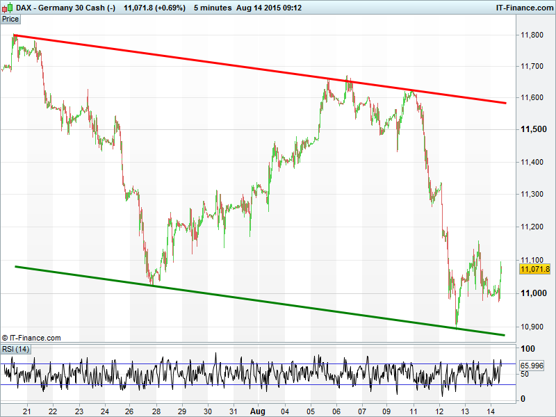 Equities mixed this morning – UK Index down, DAX and Dow ranging, Gold pulling back – as markets digest some encouraging news regarding China’s currency, a Greek bailout deal (but how many times will a deal be ‘announced’ before one actually materialises?) and a September US rate liftoff.