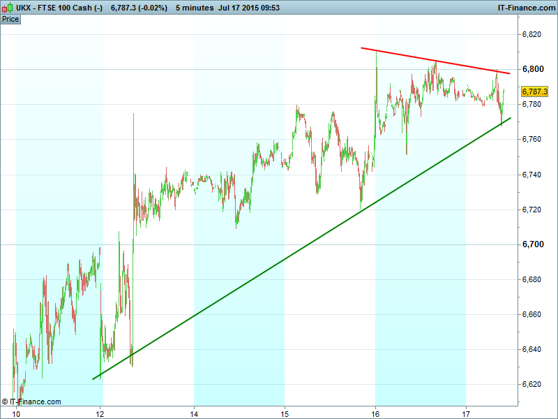 UK 100  still testing resistance at falling highs as the index consolidates ahead of the weekend and potential further gains next week as the Greece situation grinds onward to completion (until the next one). Note 200-day MA @ 6800 remains the major hurdle.