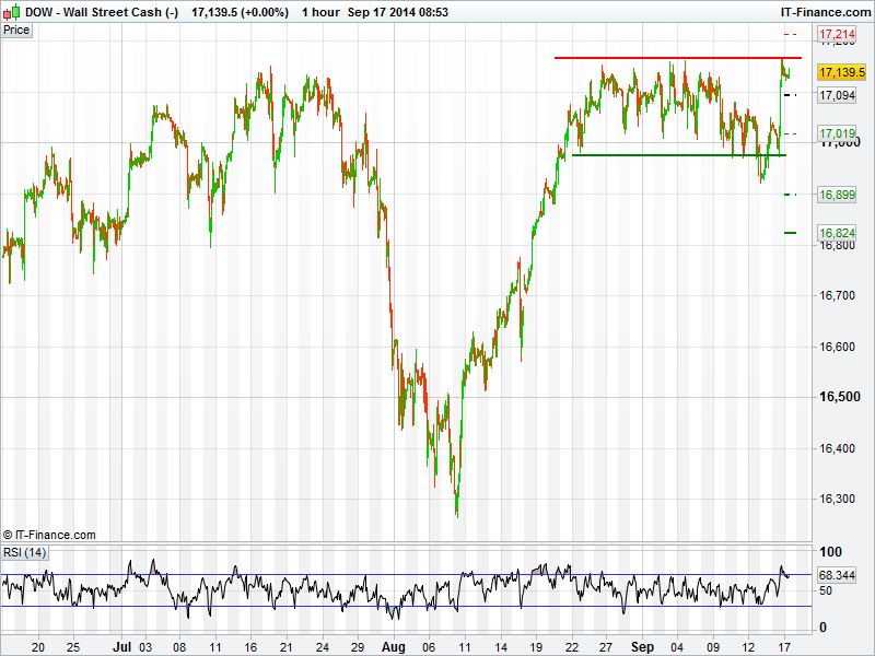 The US Dow Jones found resistance at all-time highs again yesterday after dovish comments from renowned Fed watcher Nilsenrath gave that market a lift. This keeps the Dow trading in the range it has been in for the past month ahead of tonight eagerly anticipated FOMC statement. For now though it looks as if this sideways channel will continue.