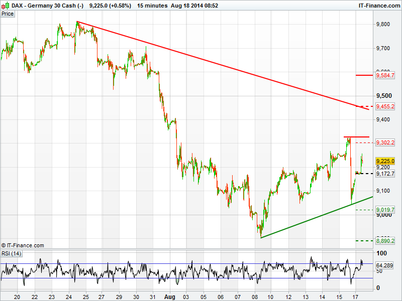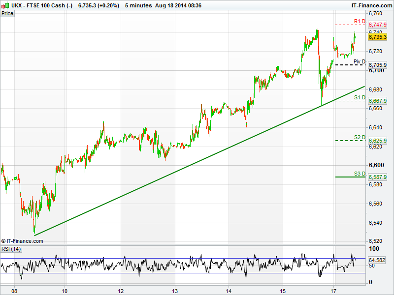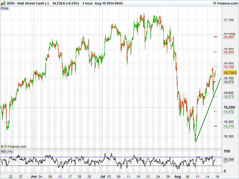 The US Dow Jones like its European peers is eating back into Friday’s losses with potential resistance at 16780. However, a break above this level could see an attempt to retake 16900 and then on to 17000 again. Macro data is thin today so all eyes with surely be on the developments of global tensions to determine the next move.
