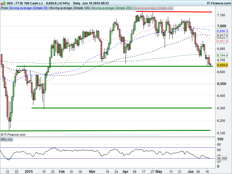 UK 100 still testing Tuesday’s lows of 6655 and the highs of December 2014. The level needs to hold if we are to see recovery rally. Note the 200-day moving average 6744 serving as resistance yesterday. Downtrend from end-may unabated.