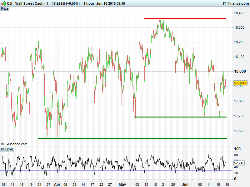 US Dow Jones rebound looks like losing steam. Higher lows are a plus. But resistance a 18000 keeps trend of falling highs from mid-May in play and could scupper the possibility of a bullish double-bottoms from 17700 if the neck at 18100 can’t be broken.