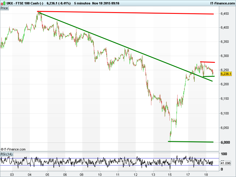 UK 100 sideways around 6250, taking a pause after 4% recovery rally and following failures at 6280. Overnight lows 6227 holding up for now, but momentum cleraly waning. Potential for any break-down to be limited by 2-week intersecting trendline.