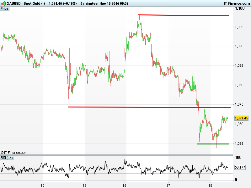 UK Index still sideways around 6250 after failure at 6280. Dax has double intersecting support around 10900. Wall St holding above 17450 after pullback from 17600. Gold made fresh 5.5yr lows of $1064 overnight.