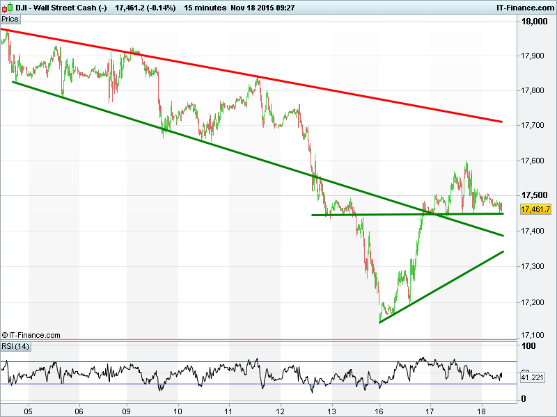 US Dow Jones futures holding up at 17450, however, potential for 2-day H&S top reversal to result in a breakdown towards 17300. Failure at 17600 highs last night maintains downtrend from early November.