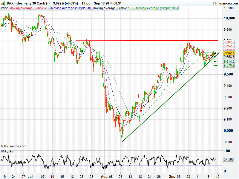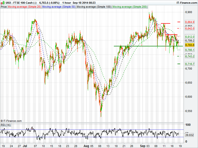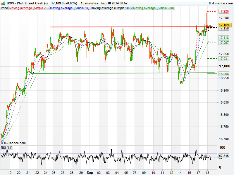 Markets are mixed this morning as dovish comments from the FOMC last night pushed the Dow to a new all-time high as it broke into the 17200’s. Markets were treading water for much of the session as traders were waiting on the comments from the FOMC before deciding on a direction. Closer to home, the latest polls on Scottish independence show the “no”  vote still leading, however, with many voters still in the “don’t know” camp, it could still be a close call. The UK Index could tread water again today ahead of the vote as traders look to position themselves for the final outcome.